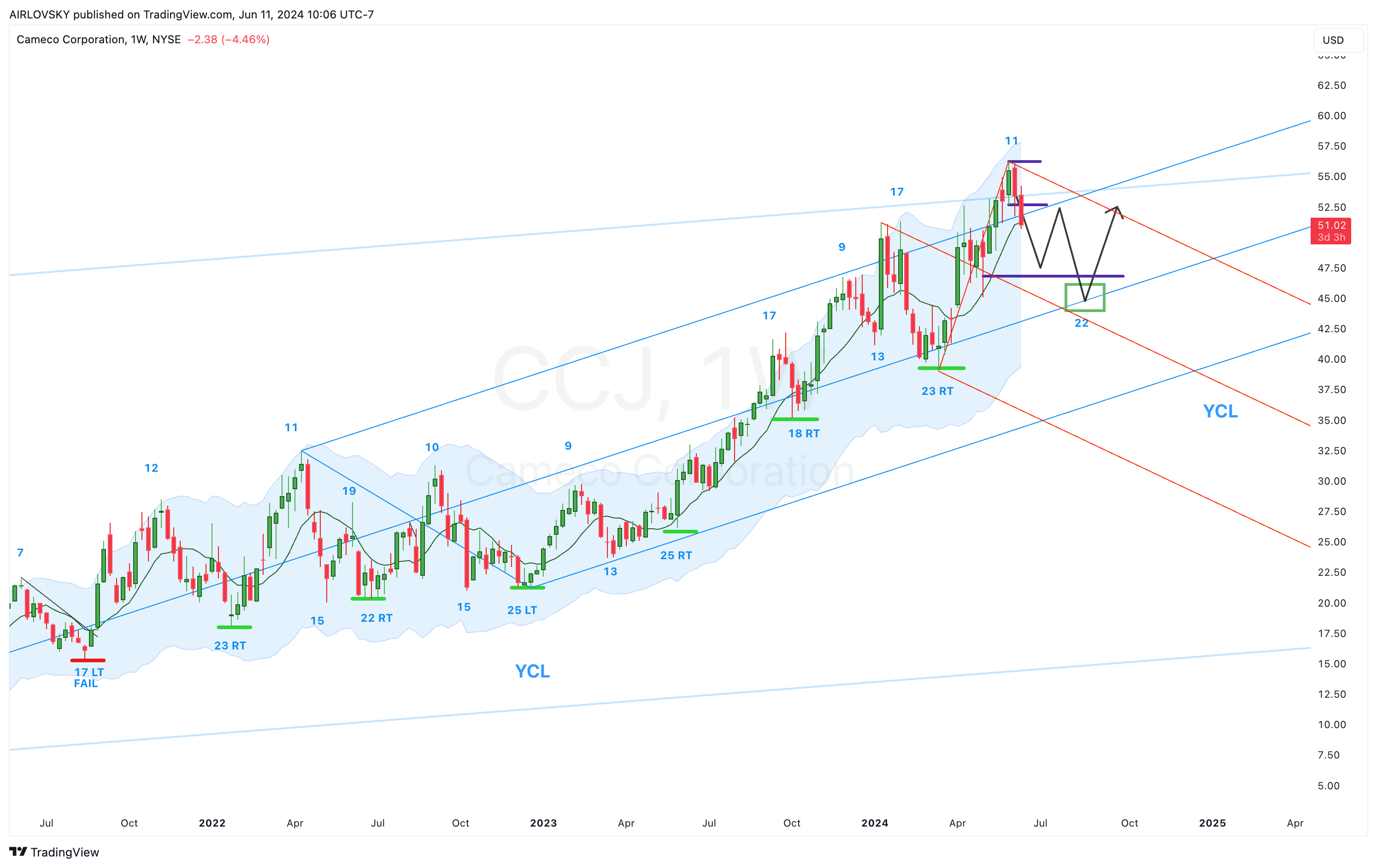 $CCJ is working on a weekly swing, but not yet secured. If printed, we would start to look at the weekly cycle decline to expected ICL in August.