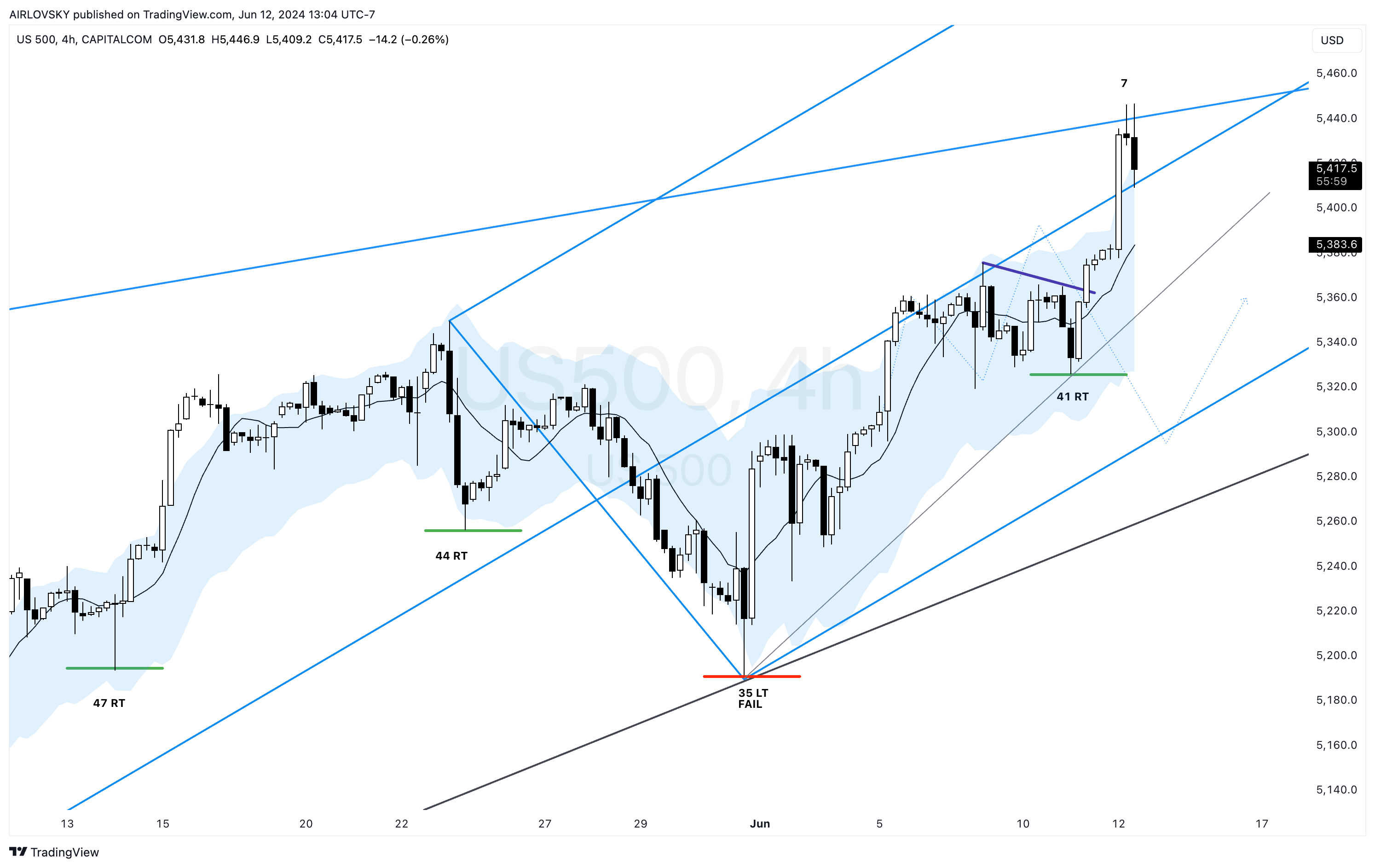 - Early 4HR cycle low confirmed on bar 41 in RT cycle. We have subsequently pushed higher to a swing high on bar 7 (HCH) in time for the FOMC meeting.