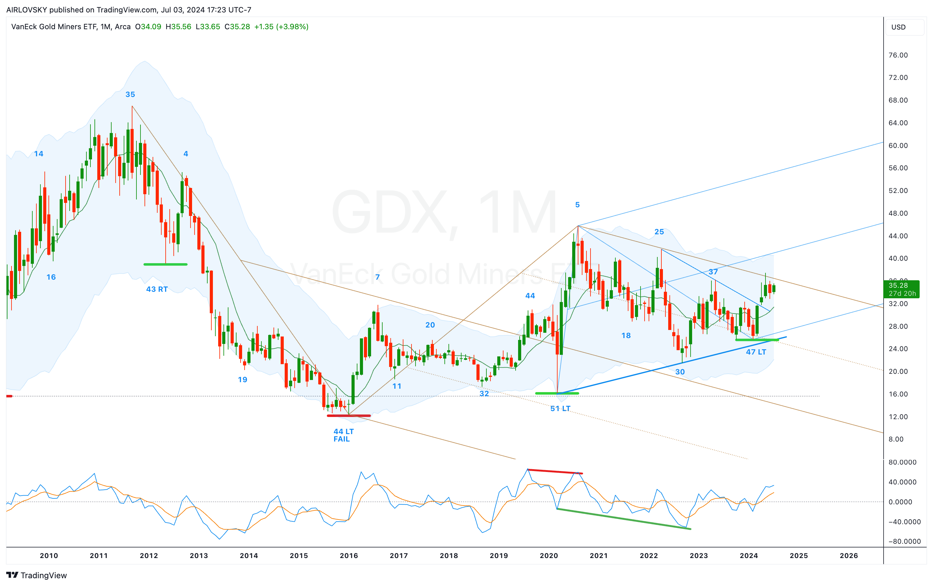 As we step into July, it's a critical time to examine the weekly cycle structure of $GDX. With the low candle printed on week 18, historical patterns suggest that this timing aligns well with previous cycles, such as the week 17 low in January 2022 and the week 19 low in February 2024.