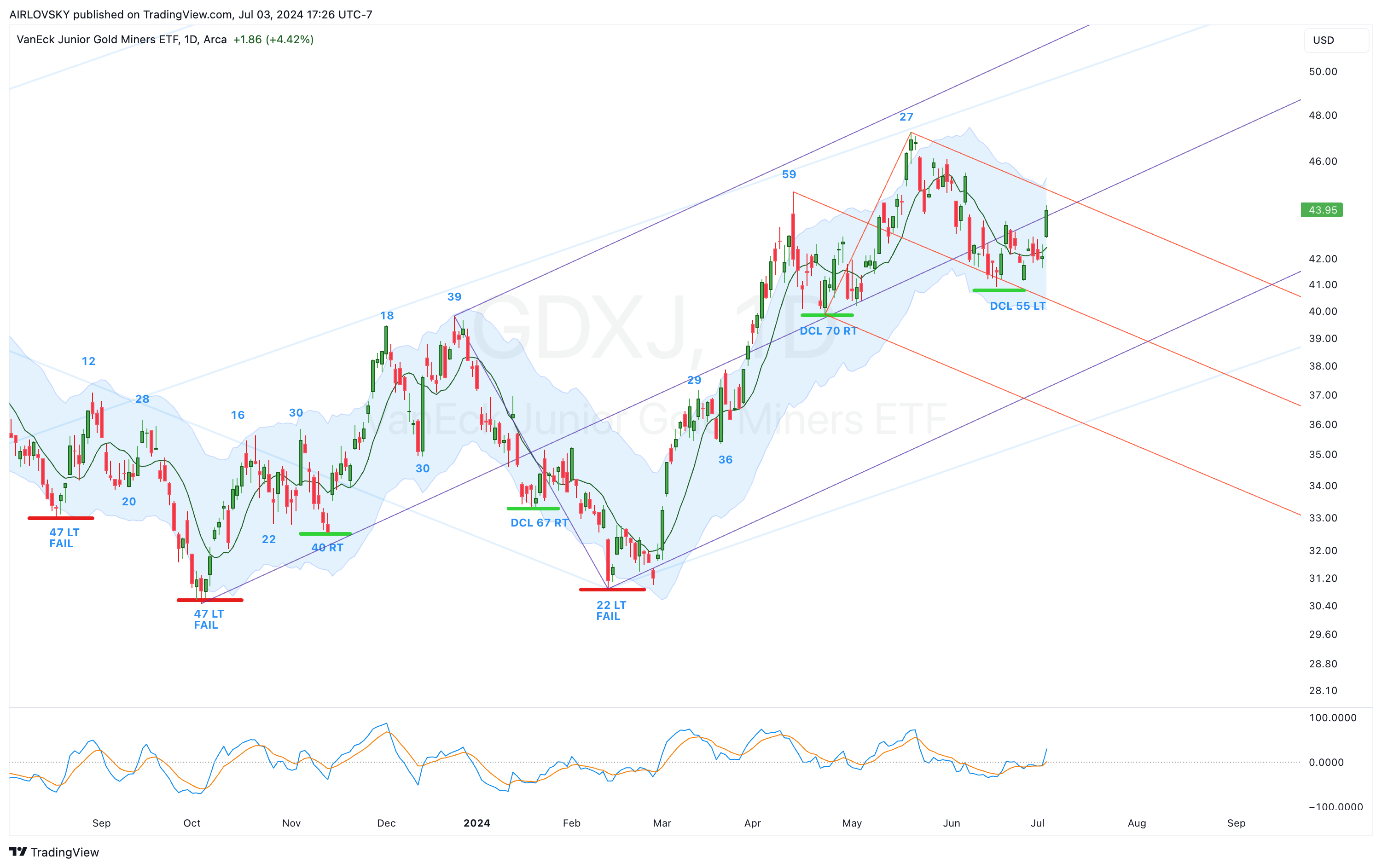 For $GDXJ, things are looking up as well. It’s a bit early for an ICL, but the daily cycle has held strong. A weekly close above the median line might indicate that we’ve managed to secure an early ICL without a daily cycle failure.